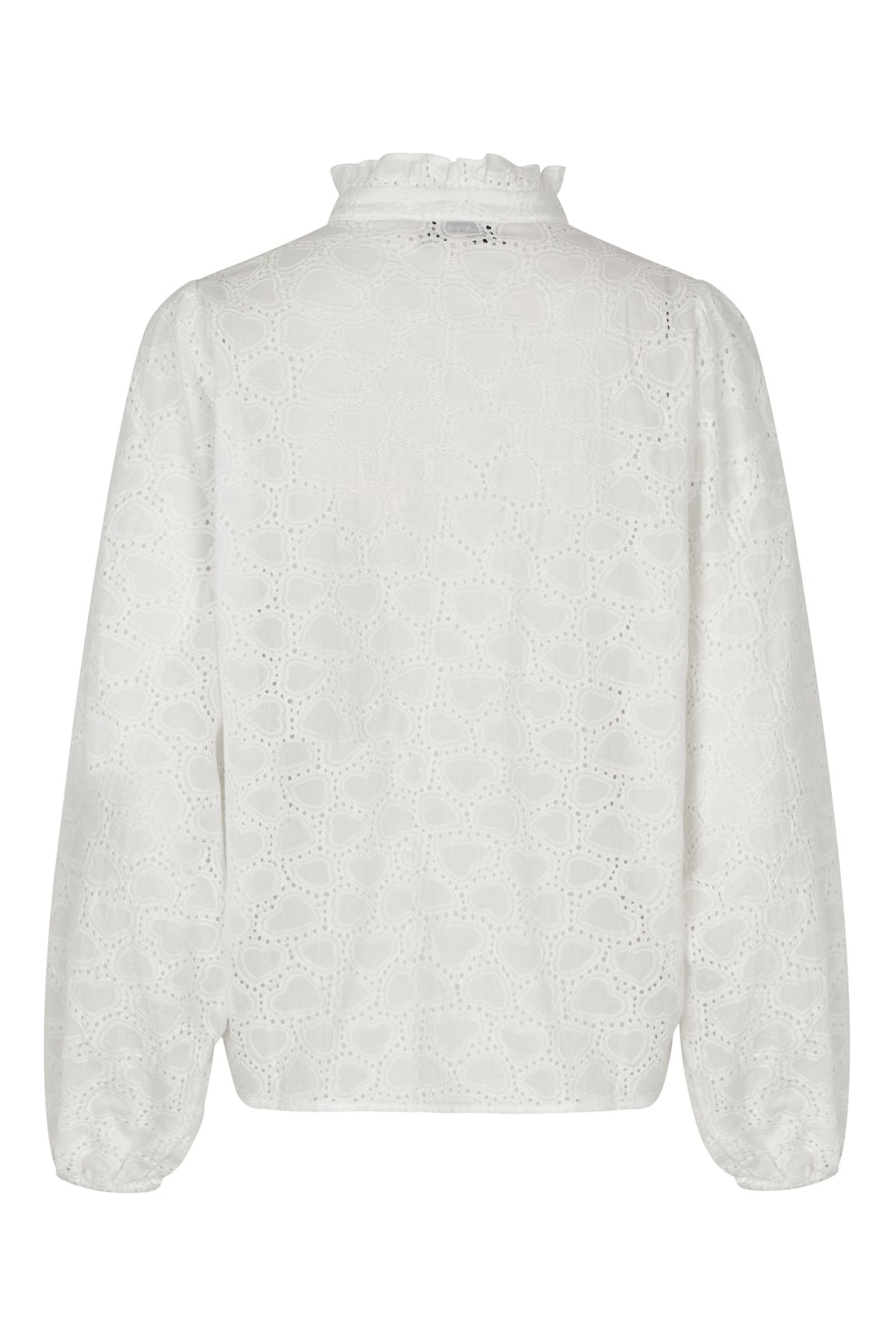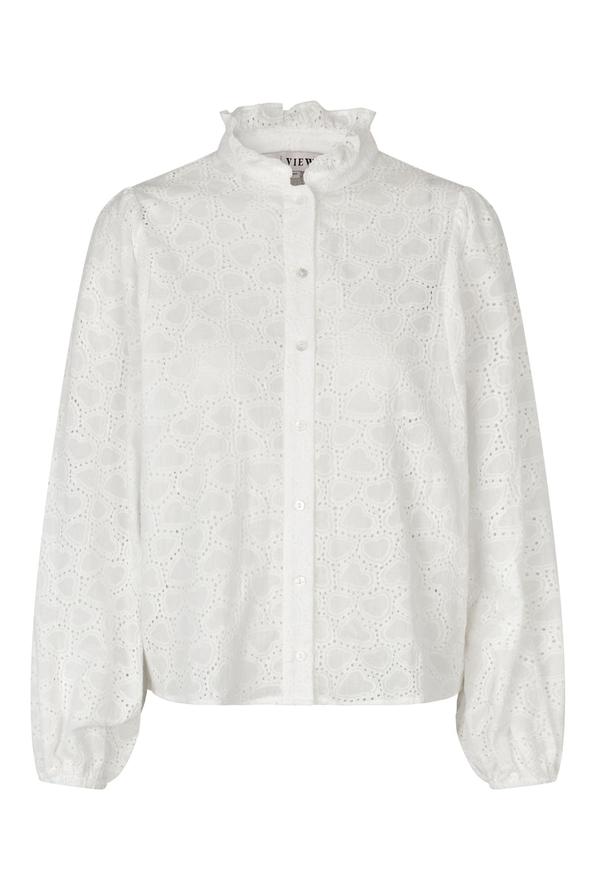 Karla Shirt er en langermet bluse med broderi. Blusen har høy krage med knapper foran. Stoffet er lett og halvgjennomsiktig. Ermene er lett puffede og rynket ved håndleddene.