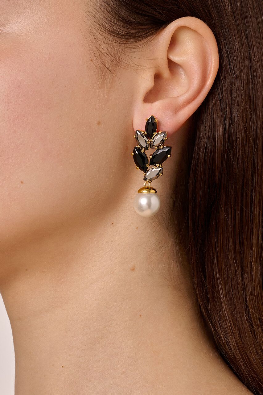 BALETE er en skøn, feminin og elegant ørenring, der vil gøre sig skønt til større og mindre sammenkomster. Den bladformede top del fuldt besat med navette formede krystaller i forskellige toner bærer en større hvid imitationsperle. Smykket er designet i poleret messing med kirurgisk øren stikker. Længden er ca 40 mm. Her vist i guldtonet og et miks af sorte og gråtonede krystaller. Designet i Danmark og fri for cadmium, nikkel og bly.