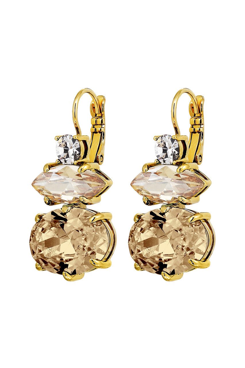 PARSANA er en dekorativ og feminin ørenring, forsynet med en lukket lås. De tre forskellige facetslebne krystaller spiller sammen i et smukt spil farvespil, her i gyldne og klare toner på guldtonet metal. Længden er totalt ca 30 mm – designet er dansk, og naturligvis nikkelfrit