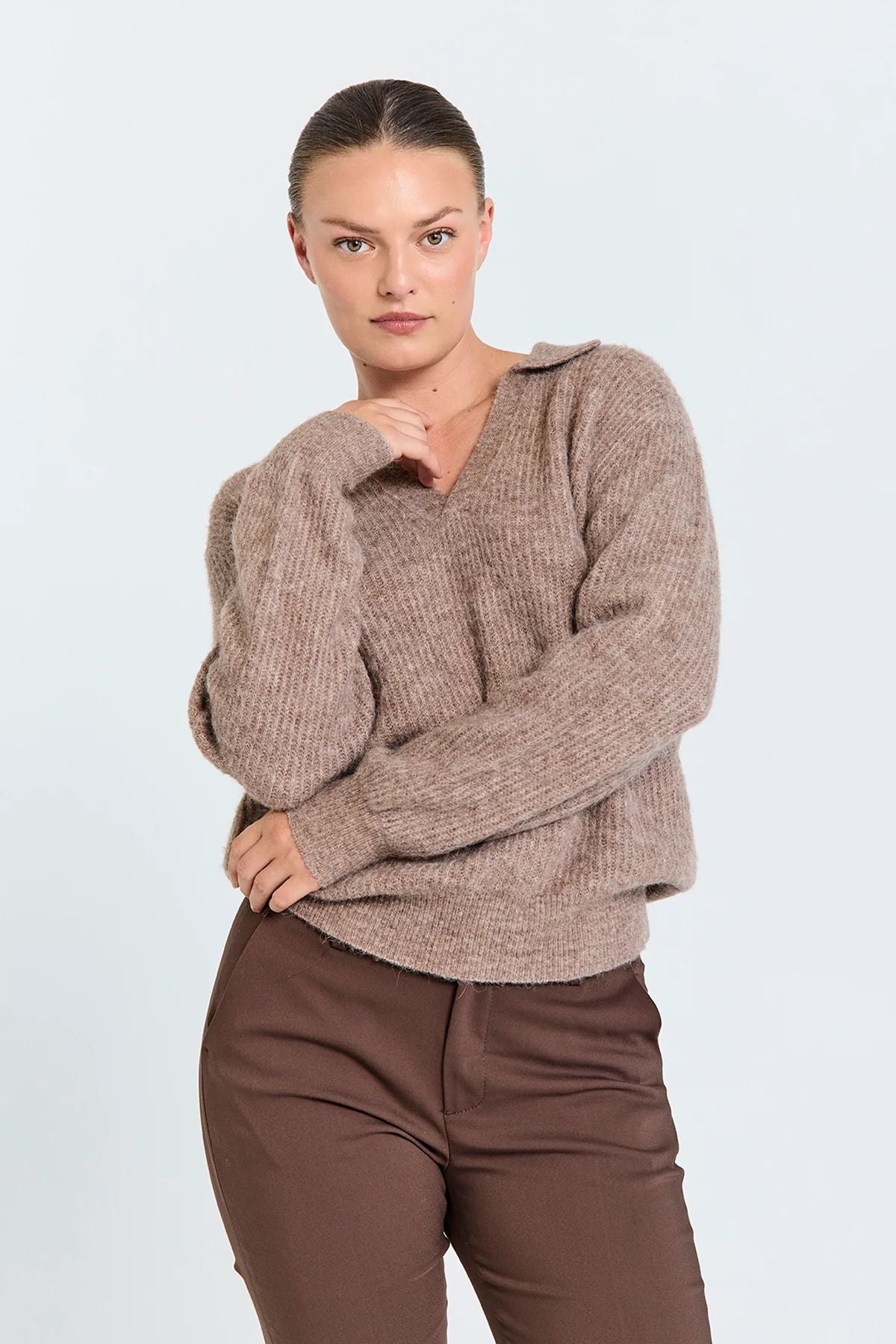 Genser fra Frequent i et mykt materiale med ribbet tekstur. Genseren har lange ermer, polokrage, V-hals, bred ribbekant og en normal passform.