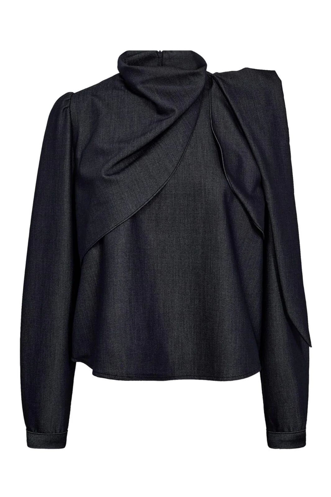 Nydelig bluse fra Gossia i mørke blå. Blusen har et unikt utseende med lange ermer og høy hals.