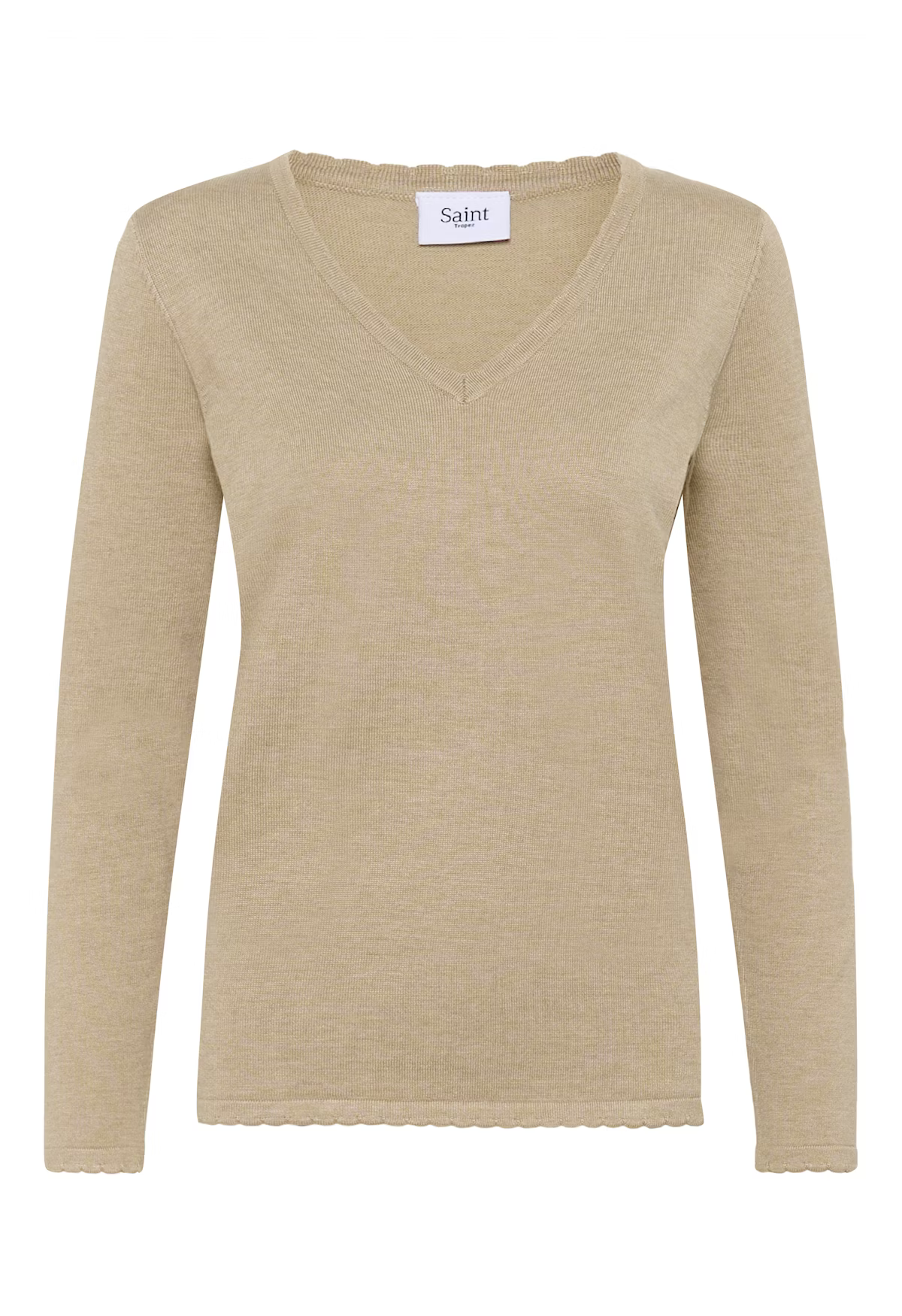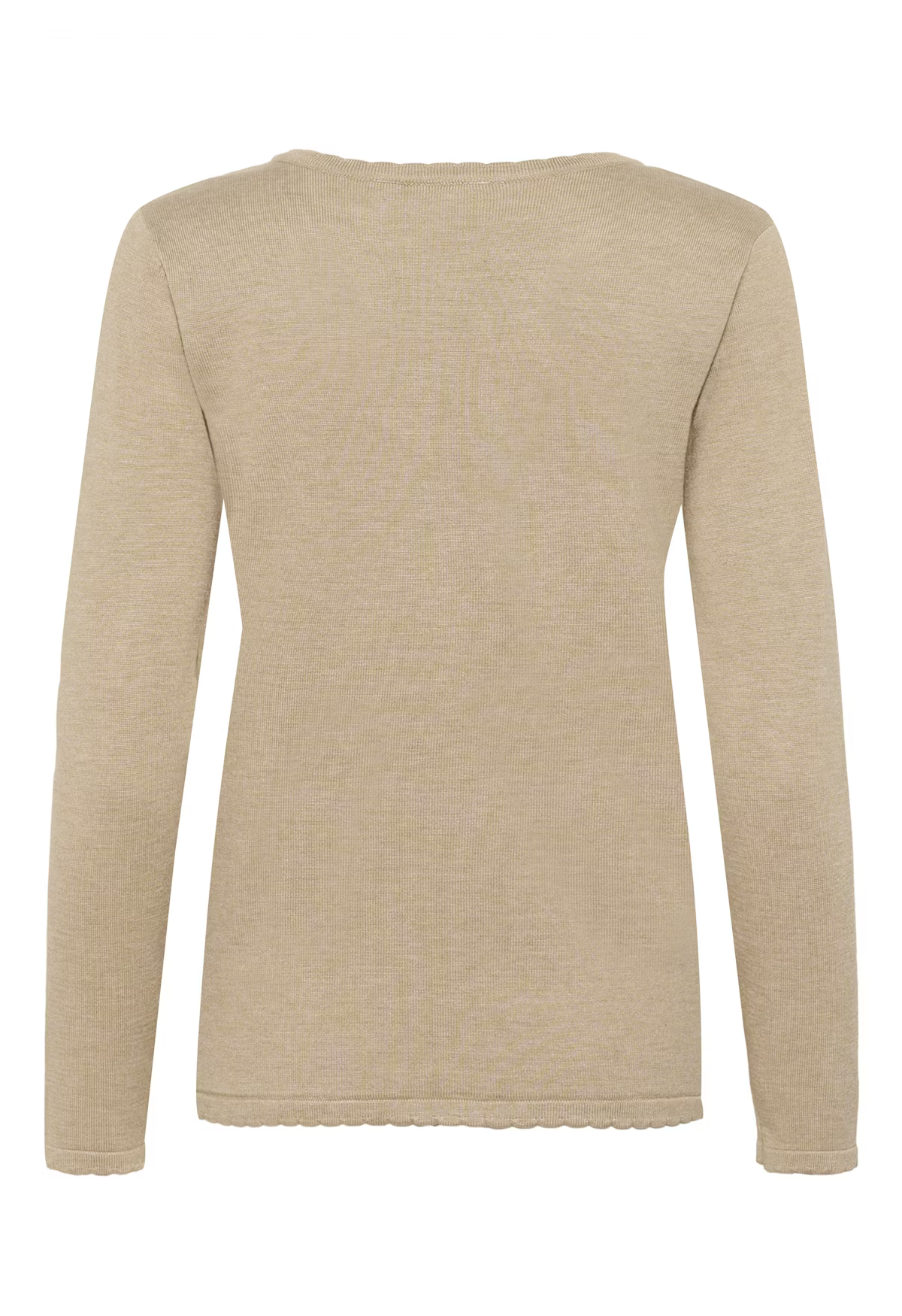 Beige strikkegenser med V-hals og lange ermer. Smal passform med fine bølgete kanter på hals, ermer og nederkant.