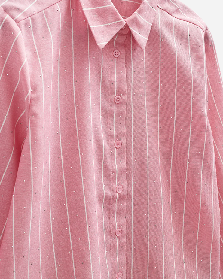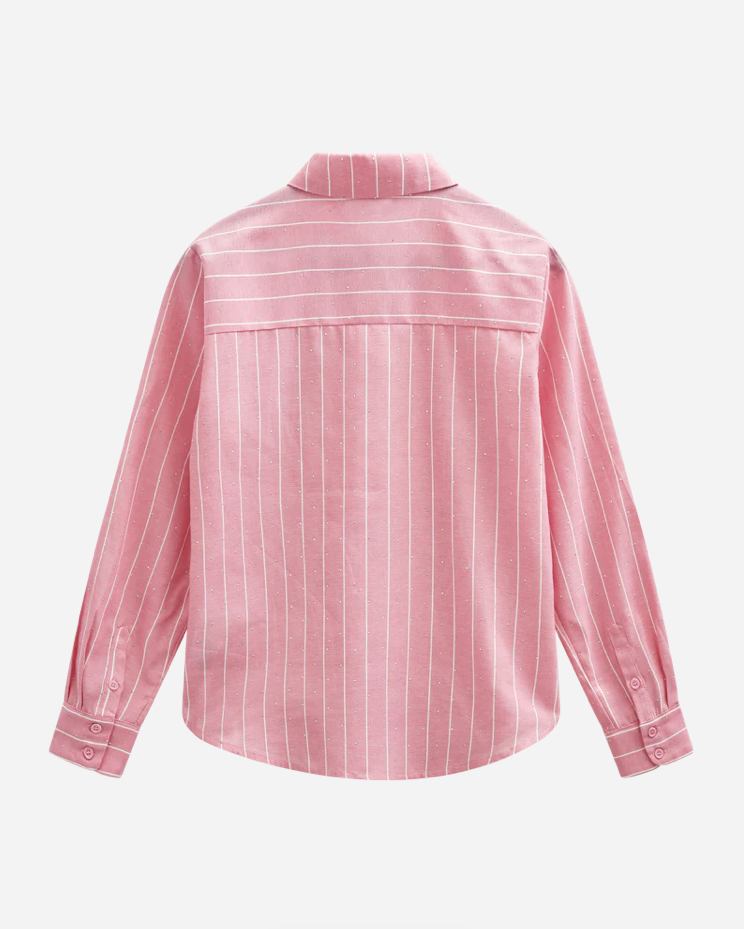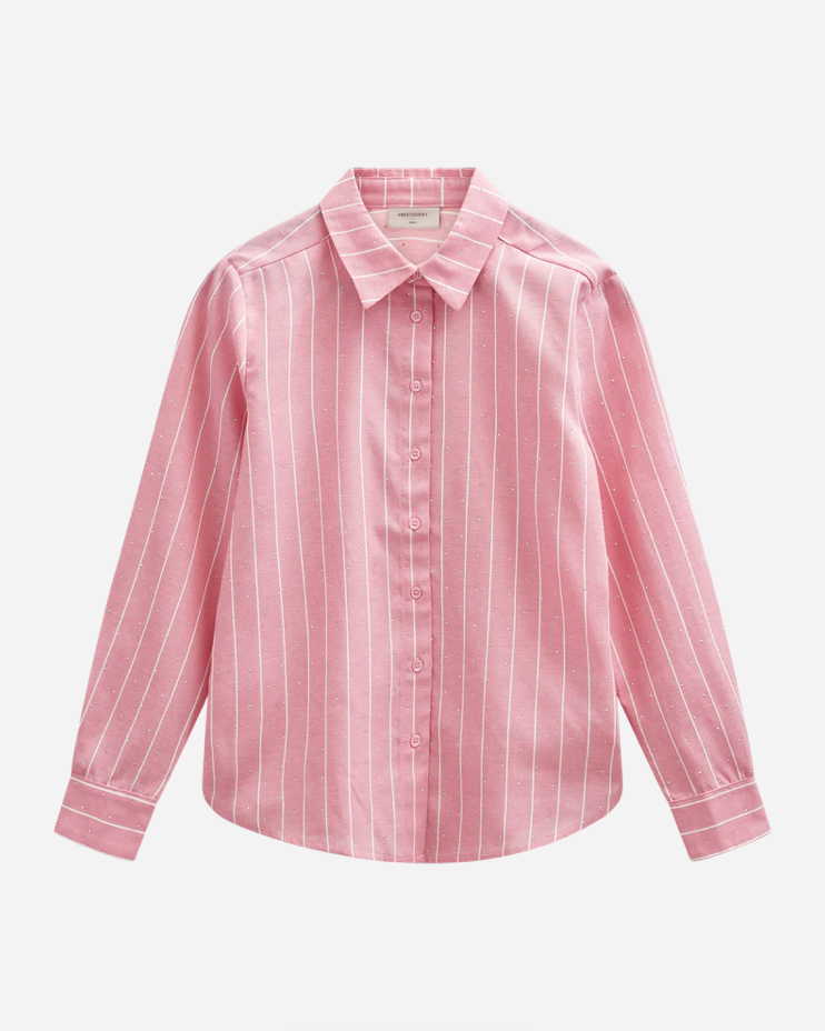 Skjorte fra Freequent i et lett materiale med stripete trykk og gjennomgående hotfix-strass for et stilig utseende. I tillegg har skjorten lange ermer med mansjetter, knappelukking foran samt en vanlig passform.
