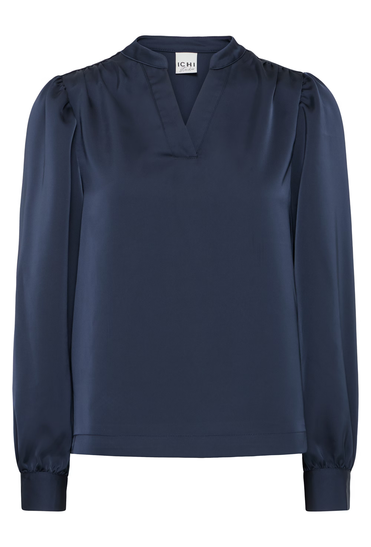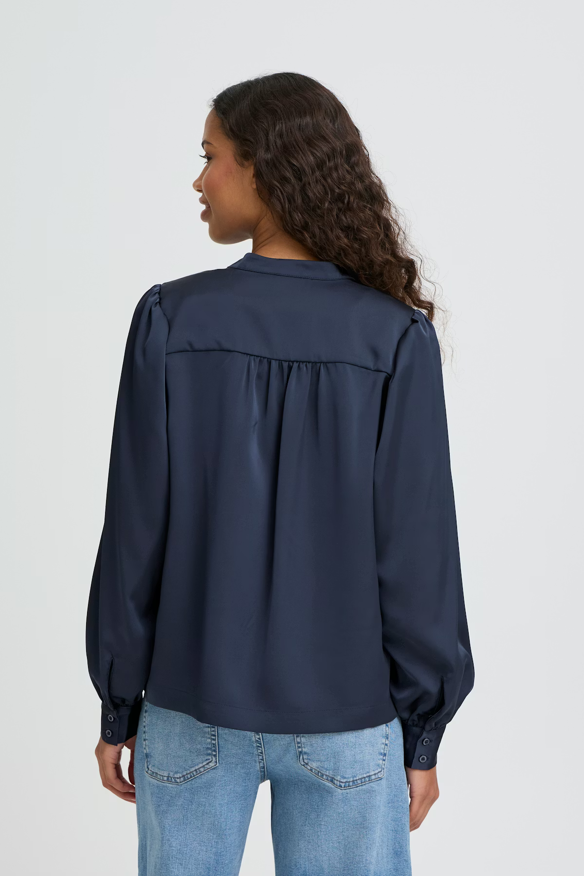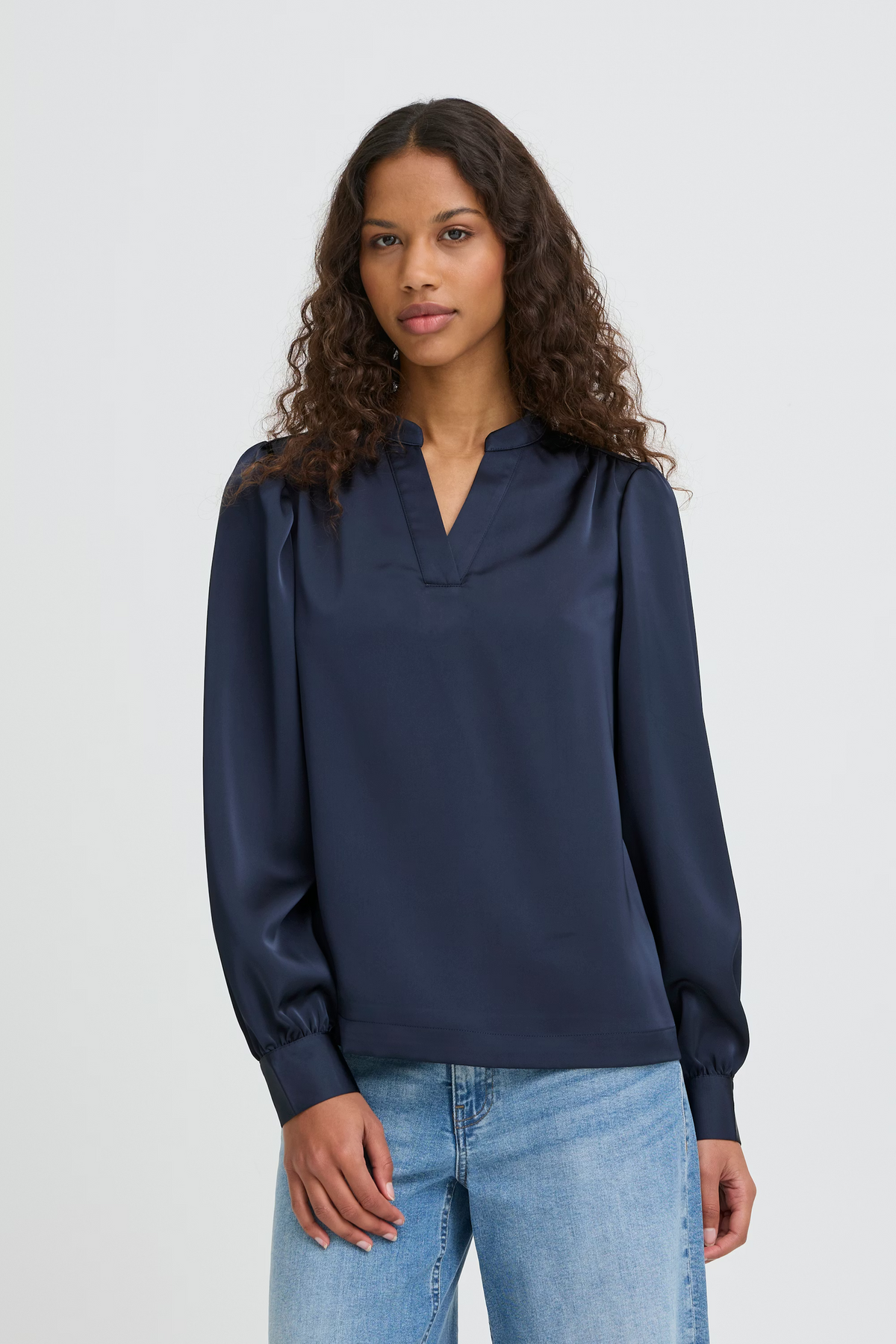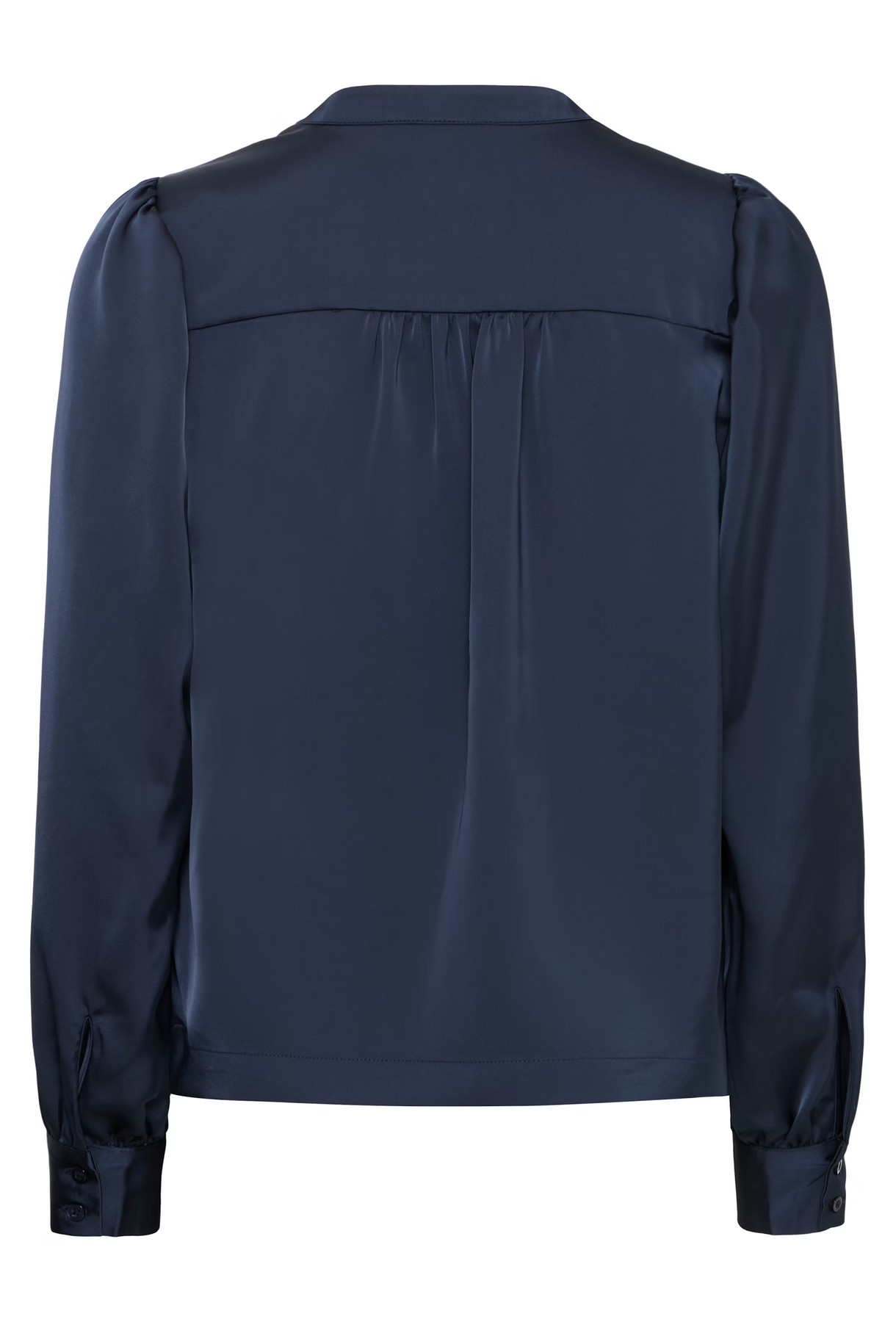 Bluse med V-utringning og diskret glans. Rett passform, lange ermer med mansjetter og lett rynking ved skuldrene.