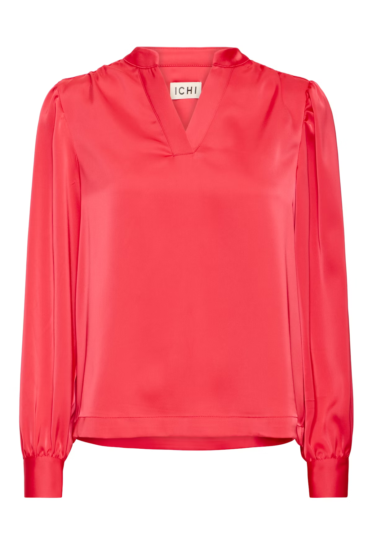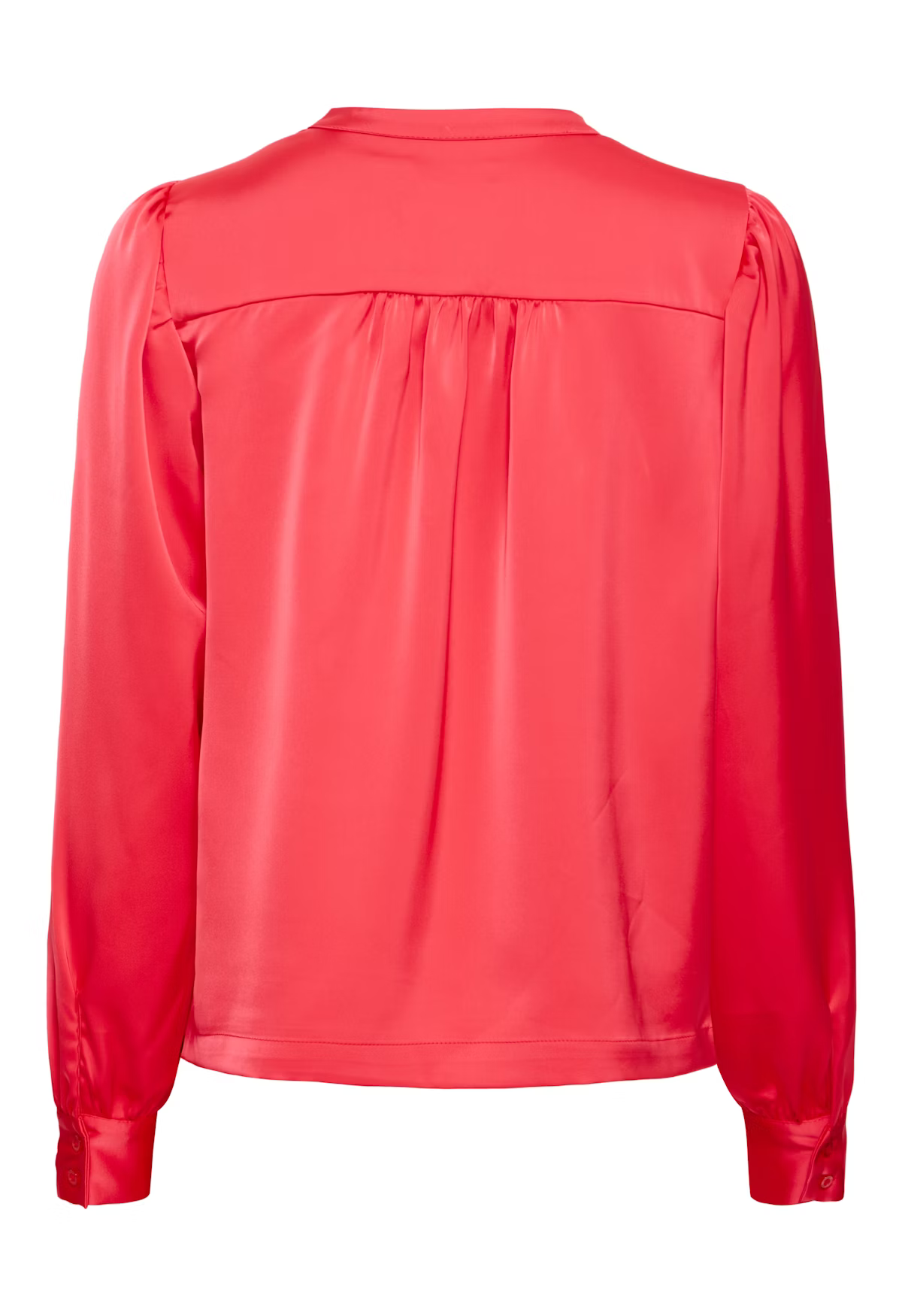 Bluse med V-utringning og diskret glans. Rett passform, lange ermer med mansjetter og lett rynking ved skuldrene.