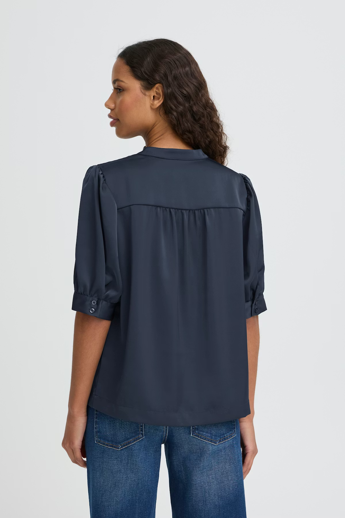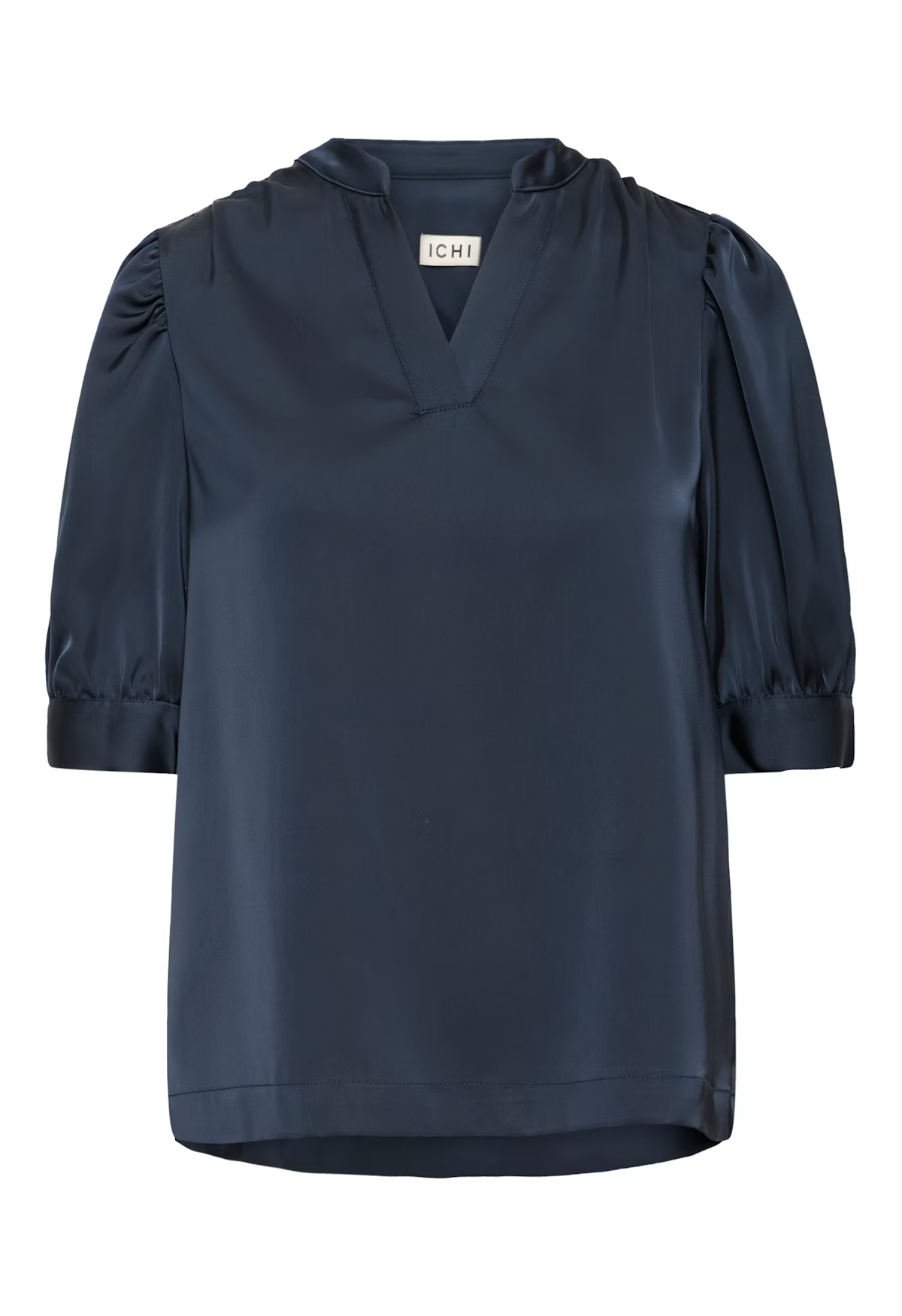 Bluse med diskret glans, rett passform, V-utringning med kragedetalj, korte puffede ermer og rynkeeffekt ved skuldrene.