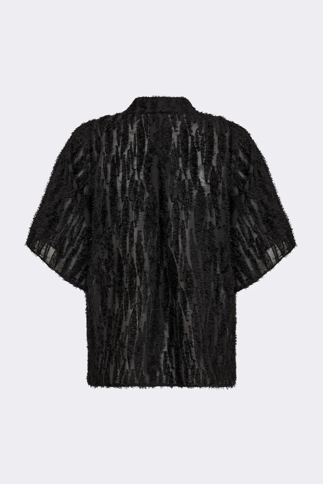 LR-OHANNA 1 er en bluse laget av 100 % resirkulert polyester. Denne blusen har en myk tekstur med v-hals, korte ermer og et diskret vevd mønster. Kombiner den med skreddersydde bukser eller et avslappet skjørt for et elegant utseende.