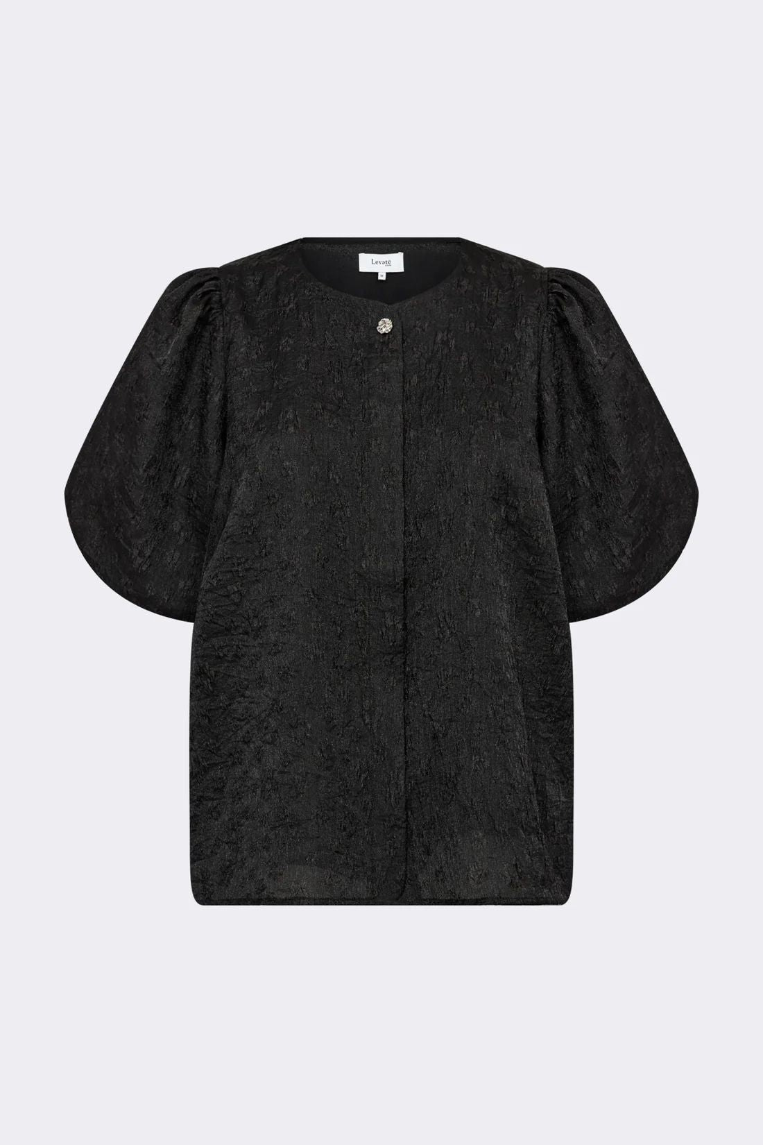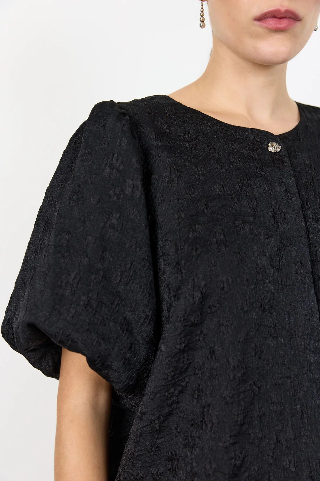 LR-ORIT 2-blusen er laget av 81 % polyester, 19 % polyamid. Den har rund hals, en flott knappelukking foran og korte puffermer med teksturert stoff. Kombiner den med skreddersydde bukser eller et blyantskjørt for et elegant utseende.