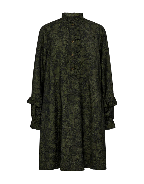 Kjole fra Freequent i et luksuriøst materiale med et elegant paisley-trykk. Kjolen har lange ballongermer med elastiske mansjetter, rysjer i kragen, langs knappelukkingen og på ermene, sidelommer, sidesplitter og en lett A-form.
