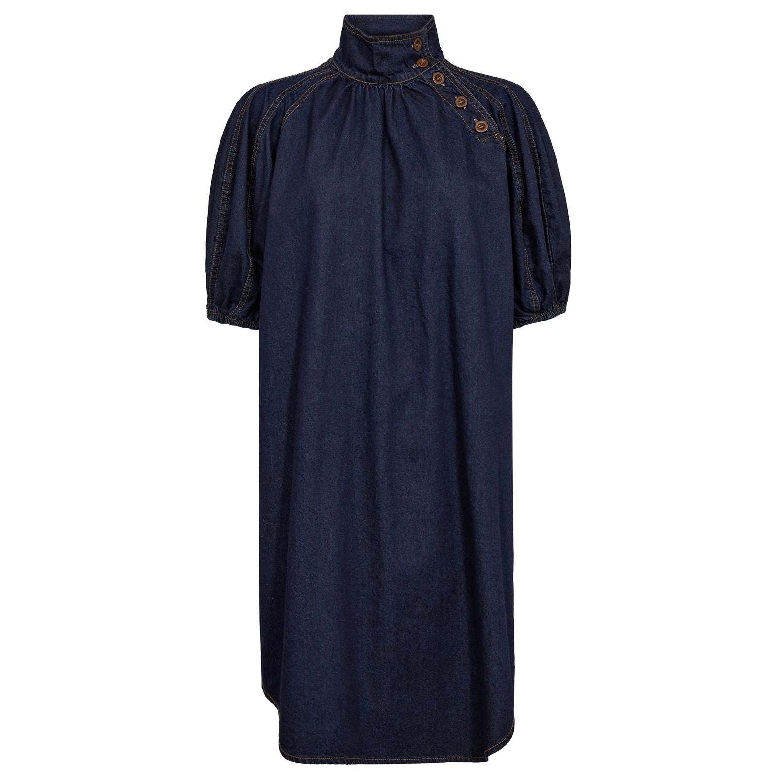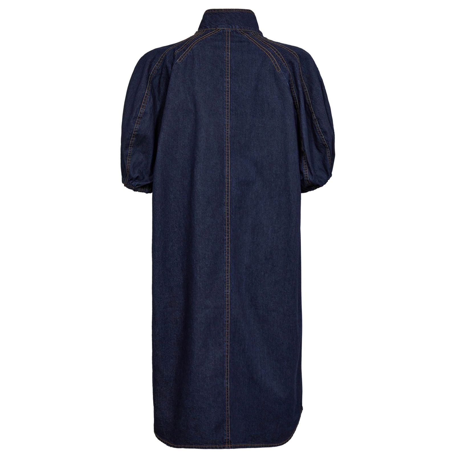 Mørk denimkjole med fine detaljer. En vakker kjole i mørk denim, perfekt for høsten. De lyse puffermene med strikk og den skråstilte knappelukkingen i halsen gir et feminint og unikt uttrykk. Fine detaljer ved ermene fullfører det stilige utseendet.