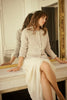 Denne cardiganen har en rett passform med rund hals og lange ermer. Lukningen foran har små knapper og en diskré rysjekant langs stolpen og falden, noe som skaper en delikat teksturert detalj gjennom hele plagget.