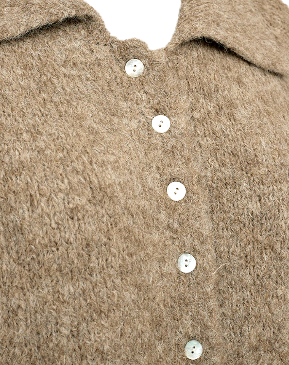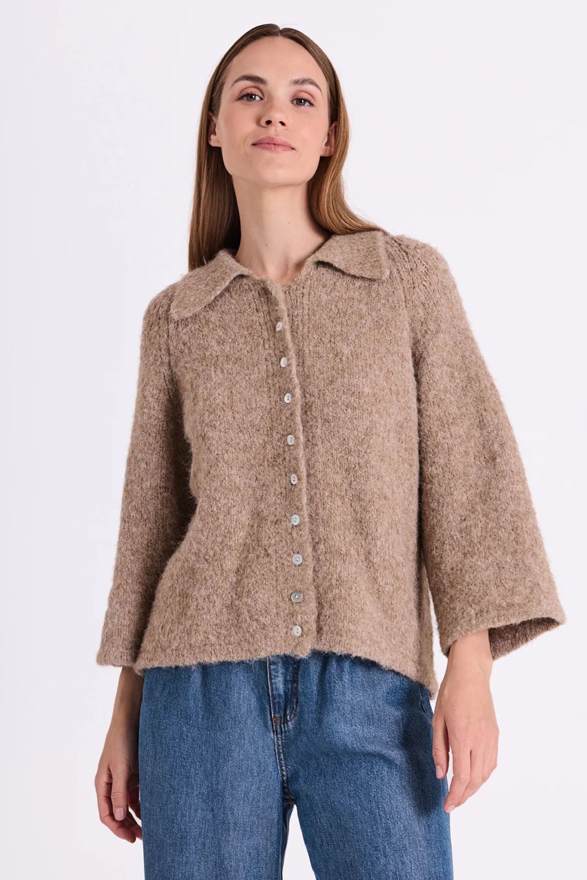 Cardigan fra Freequent i et mykt, strikket materiale. Cardiganen har en enkel silhuett med trekvartlange, vide ermer, et bredt kragebein samt de fineste skallknapper foran.