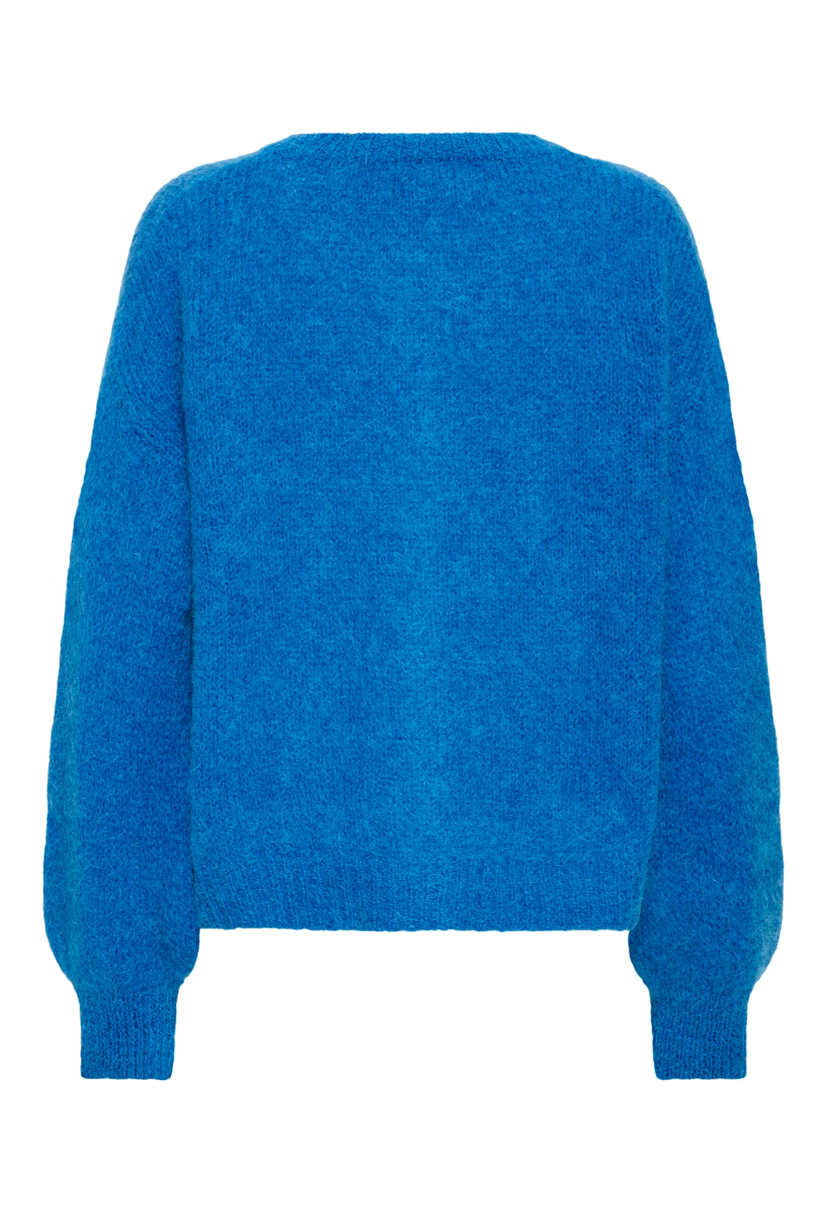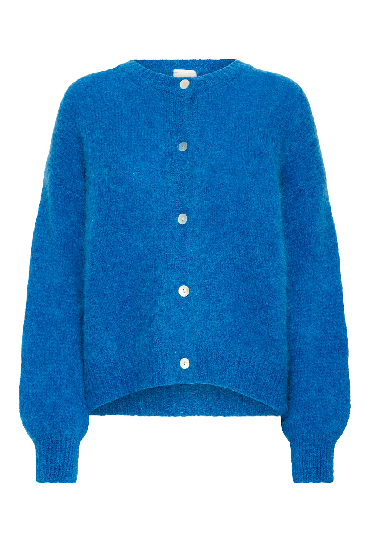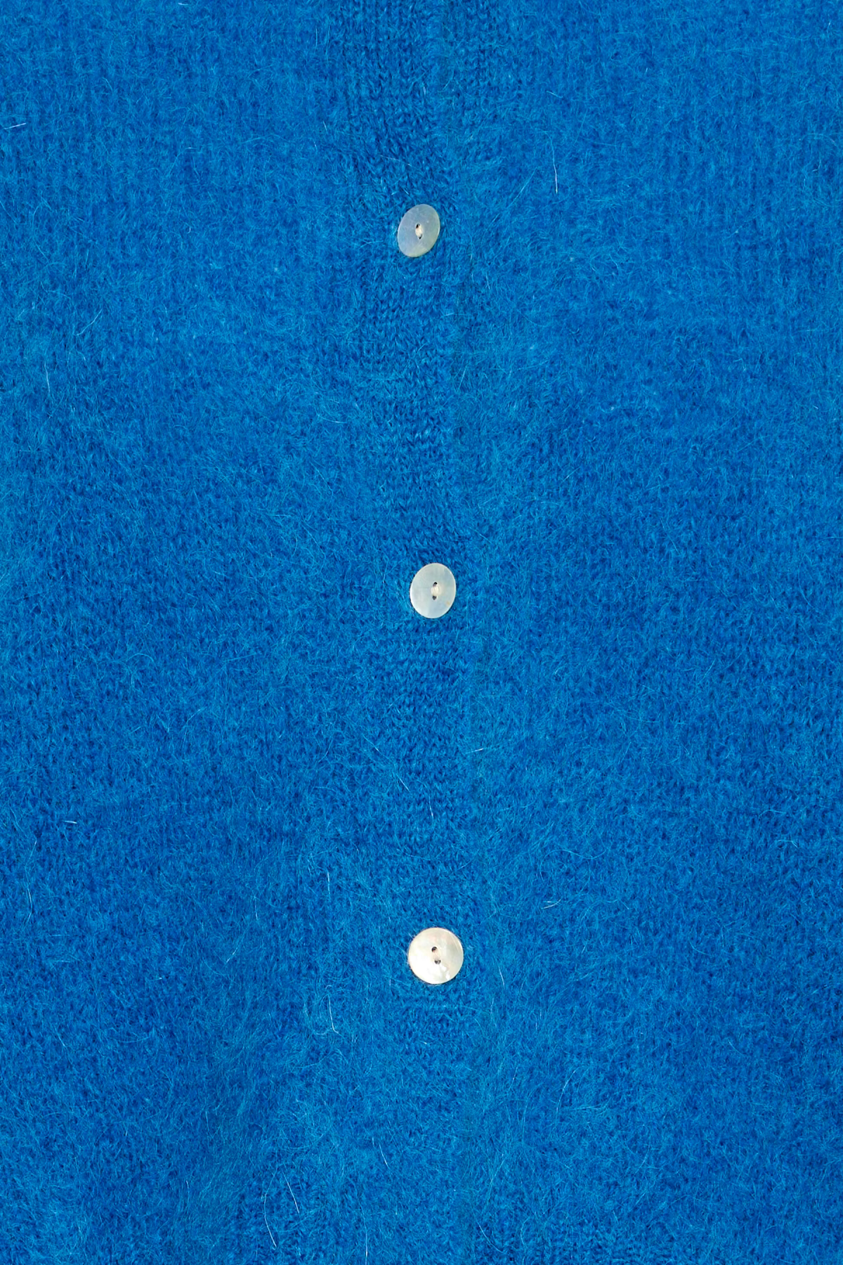 Dette er en strikket cardigan i deilig mohair-blanding, med knappelukking i front.