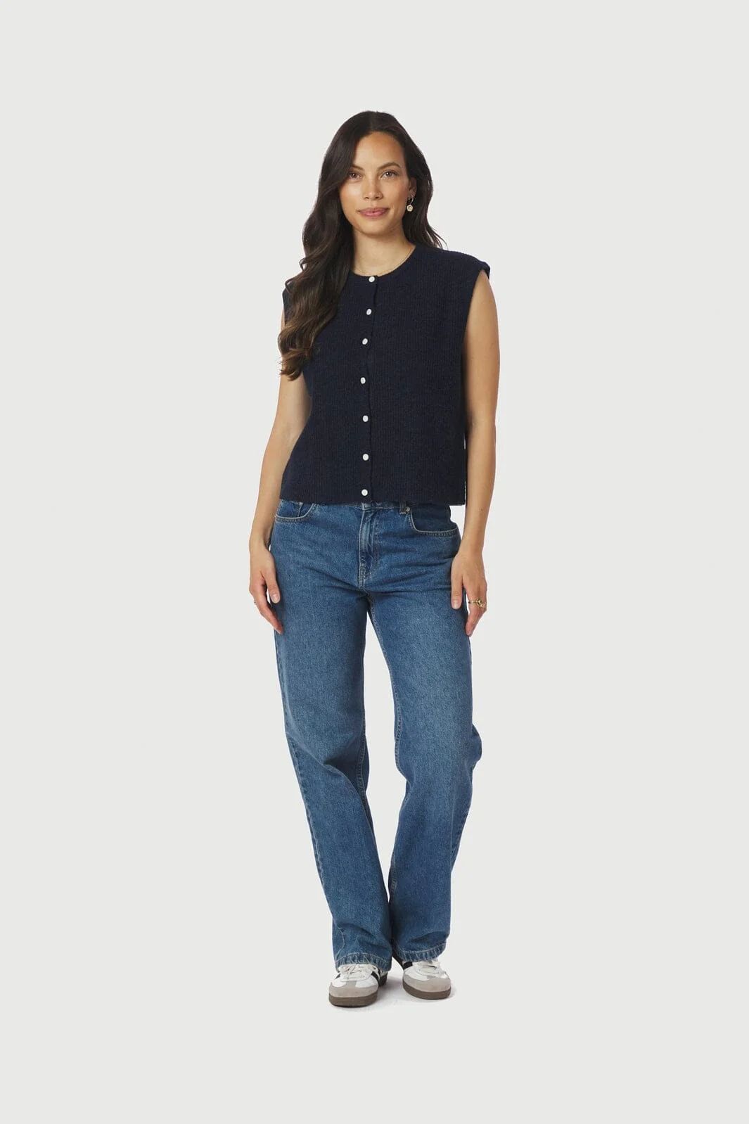 Strikket vest fra Neo Noir. Vesten har knapper og rund hals.