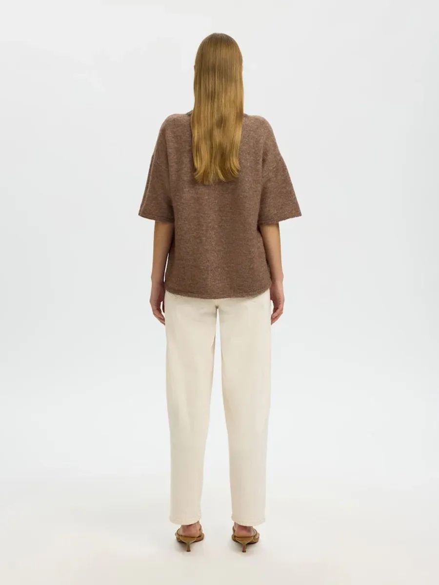 Strikket t-skjorte med en komfortabel, normal passform. Den har vide, korte ermer og ribbestrikkede mansjetter