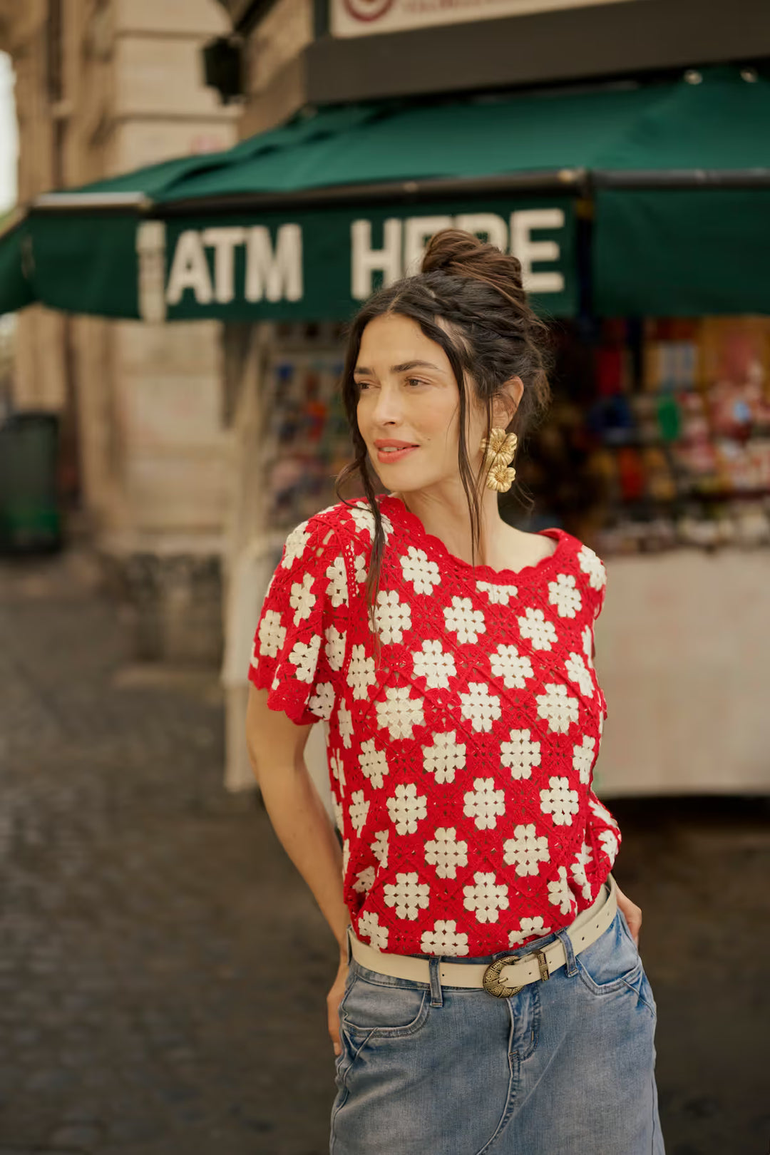 CREAM CRKip crohet blouse Red and birch crochet flower